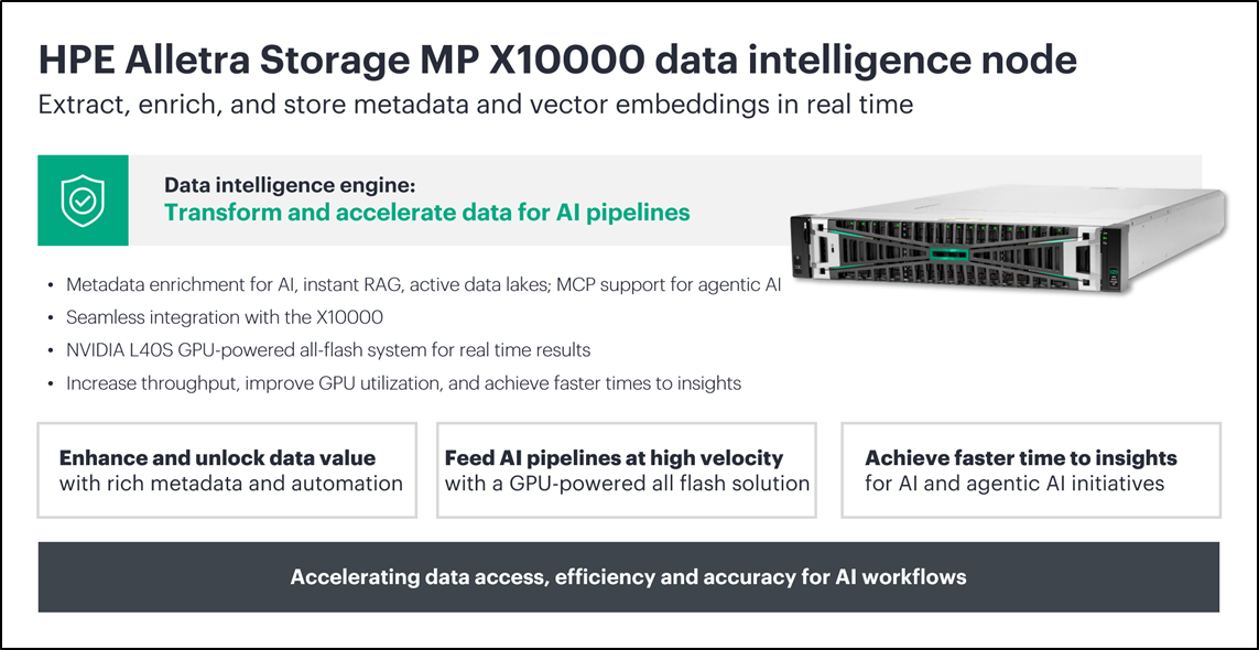 HPE Alletra Storage MP X10000 Data Intelligence Node 以內嵌式中繼資料強化與向量嵌入,結合 NVIDIA L40S GPU 與 MCP Server,協助企業加速 RAG/LLM 與 Agentic AI,縮短 time-to-first inference。